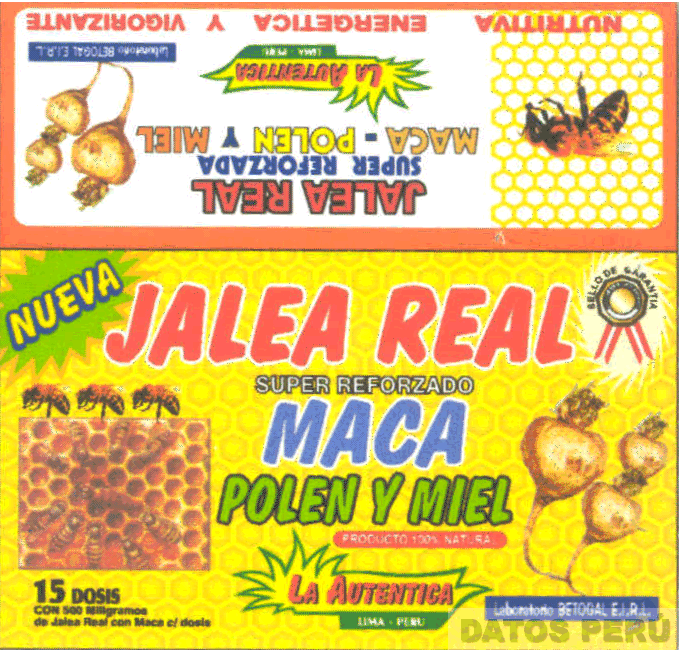 LA ETIQUETA ESTA CONSTITUIDA POR UNA COLMENA, ALVEOLOS DE BANDEJAS DE CERA EN EL LADO IZQUIERDO, ABEJAS Y AVISPAS A LA PARTE SUPERIOR IZQUIERDA Y LA FIGURA VEGETAL DE LA MACA AL LADO DERECHO, DEBAJO DE ELLAS LAS DENOMINACIONES JALEA REAL SUPER REFORZADO, MACA, POLEN Y MIEL LA AUTENTICA (SIN REIVINDICAR) ESCRITA EN LETRAS CARACTERISTICAS, TODO ELLO EN LOS COLORES AMARILLO, VERDE, AZUL Y ROJO; CONFORME AL MODELO ADJUNTO