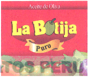 El logotipo conformado por la denominación LA BOTIJA (sin reivindicar BOTIJA) escrita en letras características, donde la letra O está representada por una aceituna, y la denominación ACEITE DE OLIVA PURO escrita en letras características, sin reivindicar, donde el término PURO aparece dentro de una cinta ondulante, todo a su vez dentro de una etiqueta cuadrangular en cuyo extremo inferior se observa el diseño de tomates, aceitunas, zanahoria, cebolla y otros vegetales, en los colores amarillo, anaranjado, violeta, rojo y verde, en distintas tonalidades; conforme al modelo adjunto