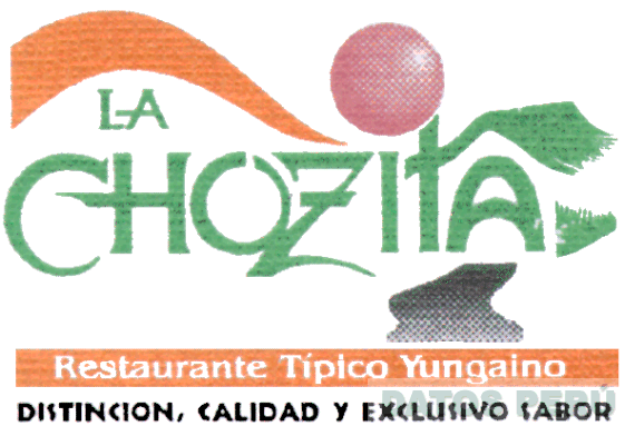El logotipo conformado por la denominación LA CHOZITA escrita en letras características de color verde, donde las letras T y A conforman la figura de una choza; en la letra I el punto representa al sol ocultándose; debajo la frase RESTAURANTE TIPICO YUNGAINO escrita en letras características de color blanco sobre un fondo anaranjado; al pie del logotipo la frase DISTINCION, CALIDAD Y EXCLUSIVO SABOR escrita en letras características de color negro; conforme al modelo