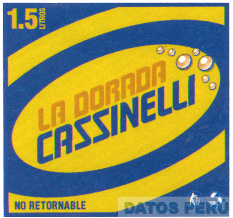 LA ETIQUETA DE FONDO AZUL EN LA QUE DESTACAN LA DENOMINACION LA DORADA CASSINELLI 1.5 LITROS CON UN CIRCULO AMARILLO Y FRANJAS AMARILLAS, LAS PALABRAS NO RETORNABLE, SEGUN MODELO ADJUNTO