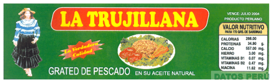 EL LOGOTIPO CONFORMADO POR LA DENOMINACION LA TRUJILLANA ESCRITA EN LETRAS CARACTERISTICAS, DEBAJO LA REPRESENTACION DE UN PLATO CONTENIENDO PESCADO Y ENSALADA, AL COSTADO LA FIGURA ESTILIZADA DE UNA MUJER CON VESTIDO TIPICO DEL NORTE DEL PAIS (SOMBRERO DE PAJA, BLUSA Y FALDA), Y LEYENDAS ALUSIVAS AL PRODUCTO, TODO EN LOS COLORES AMARILLO, ROJO, BLANCO, CELESTE, MARRON CLARO, NEGRO; SOBRE FONDO VERDE; CONFORME AL MODELO ADJUNTO