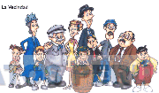 El logotipo conformado por la denominación LA VECINDAD escrita en letras características, debajo de la cual se aprecian las figuras de once personajes caricaturescos (izq. a der.)
