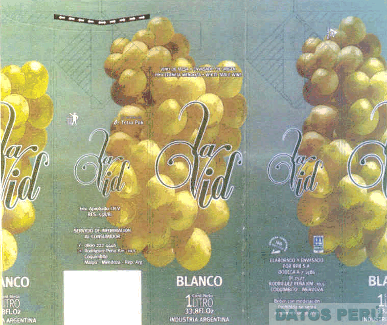 LA ETIQUETA CUADRANGULAR CONTENIENDO LA DENOMINACION LA VID ESCRITA EN LETRAS CARACTERISTICAS EN FORMA REPETITIVA, LA REPRESENTACION ESTILIZADA DE RACIMOS DE UVAS Y DEMAS LEYENDAS ALUSIVAS AL PRODUCTO, TODO EN LOS COLORES VERDE Y BLANCO; CONFORME AL MODELO ADJUNTO