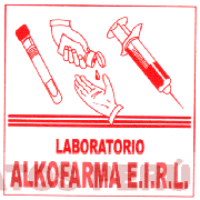 El logotipo conformado por la denominación LABORATORIO ALKOFARMA E.I.R.L. escrita en letras características; en cuya parte superior al lado izquierdo se aprecia la figura estilizada de una probeta, al centro dos manos, una de ellas sujetando un frasco del cual vierte una gota de un producto en la otra mano, y al lado derecho la figura de una jeringa, debajo se aprecian tres líneas, todo en color rojo; conforme al modelo adjunto