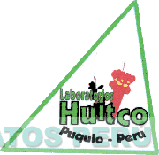 El logotipo conformado por la denominación LABORATORIOS HUITCO PUQUIO-PERU escrita en letras características de color verde y negro, sobrepuesta a la figura de una flor de kantu de color rojo y negro; todo ello encerrado dentro de una figura triangular de líneas verde; conforme al modelo adjunto