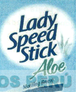 La denominación LADY SPEED STICK MORNING BREEZE ALOE escrita en letras características sobre un fondo formado por una figura oval y el diseño de un conjunto de hojas, todo dentro de una etiqueta cuadrangular, en los colores azul, celeste, verde y blanco; conforme al modelo adjunto
