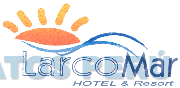 El logotipo conformado por las figuras estilizadas de un sol en color anaranjado y dos líneas ondulantes en color celeste y azul, en la parte inferior se aprecia la denominación LARCO MAR HOTEL & RESORT escrita en letras características, en los colores azul y celeste; conforme al modelo adjunto