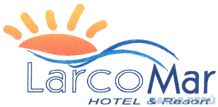 El logotipo conformado por las figuras estilizadas de un sol en color anaranjado y dos líneas ondulantes en color celeste y azul, en la parte inferior se aprecia la denominación LARCO MAR HOTEL & RESORT escrita en letras características, en los colores azul y celeste; conforme al modelo adjunto