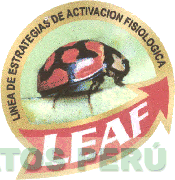 El logotipo conformado por la denominación LEAF escrita en letras características dentro de una flecha estilizada que forma la base de un círculo, y la frase LINEA DE ESTRATEGIAS DE ACTIVACION FISIOLOGICA escrita en letras características y dentro del borde de la parte superior del círculo, en cuyo interior se aprecia la figura de un insecto sobre una hoja, todo en los colores rojo, negro, verde claro, dorado y blanco; conforme al modelo adjunto