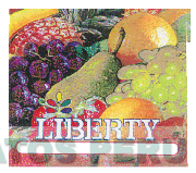 La denominación LIBERTY escrita en letras características y la representación de frutas tales como, uvas, piña, plátano, naranja, pera, fresas, mango y manzana, y leyendas alusivas al producto, todo en los colores rojo, amarillo, verde claro y oscuro, morado, marrón, negro, anaranjado y blanco; conforme al modelo adjunto