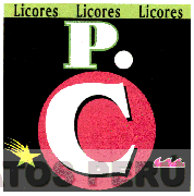 La figura conformada por una letra P y a su derecha por un punto y debajo de esta por una letra C que se encuentra dentro de un círculo, en los colores blanco, verde, negro, rojo, rosado, amarillo oro y en la parte superior la denominación LICORES escrita repetidas veces; conforme al modelo adjunto