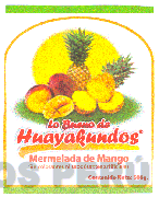El logotipo conformado por la denominación LO BUENO DE HUAYAKUNDOS escrita en letras características, acompañada de las figuras estilizadas de una piña, un mango, figuras circulares, la frase MERMELADA DE MANGO SIN COLORANTES NI SABORIZANTES ARTIFICIALES (sin reivindicar) escrita en letras características, frases alusivas al producto sin reivindicar, líneas horizontales y figuras irregulares, todo en los colores amarillo y verde en distintas tonalidades, rojo, negro, blanco, anaranjado; conforme al modelo adjunto