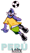 El logotipo conformado por la denominación LOBY escrita en letras características y subrayada, sobre la cual se aprecia la representación caricaturizada de un lobo de mar vestido con ropa y calzado deportivo en acto de cabecear una pelota de fútbol, todo en la combinación de colores morado, anaranjado en diversas tonalidades, amarillo, verde, gris, plomo, negro y blanco; conforme al modelo adjunto