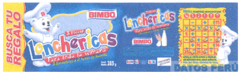 La envoltura conformada por las denominaciones LONCHERICAS PARA TODA LA SEMANA y BIMBO escrita en letras características y figuras estilizadas de un osito cocinero con los brazos extendidos, al extremo derecho se aprecia al osito al costado de un tablero y demás elementos sin reivindicar, todo en la combinación de colores amarillo, rojo, azul, anaranjado, lila y negro; conforme al modelo adjunto