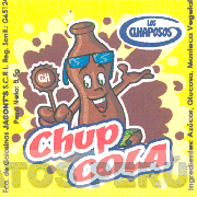 La caricaturización de una botella sobre una figura irregular; apreciándose sobrepuesta a ésta última, las denominaciones LOS CHAPOSOS escrita en letras características, encerrada en un óvalo y CHUP COLA escrita de forma característica; asimismo, se observa a ambos lados de lo mencionado, frases alusivas al producto; todo en los colores amarillo, marrón, blanco, azul, celeste, verde, rojo y negro; conforme al modelo adjunto