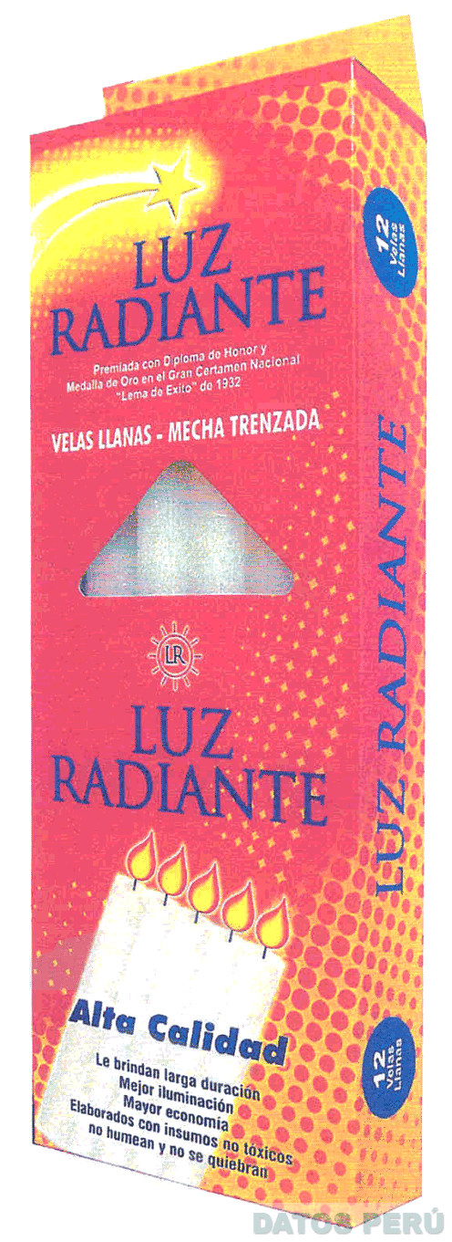 La caja empaque conformada por la denominación LUZ RADIANTE escrita en letras características; la figura estilizada de una estrella fugaz, en la parte superior e inferior se aprecian figuras circulares y en la parte central se observan las letras L y R escritas en forma característica dentro de la figura estilizada de un sol; en la parte inferior se observan las figuras estilizadas de cinco velas largas; en la parte lateral derecha se aprecian las figuras estilizadas de estrellas de cuatro puntas; todo en la combinación de colores rojo en distintas tonalidades, anaranjado en distintas tonalidades, amarillo, azul y blanco; conforme al modelo adjunto