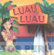 El logotipo conformado por la denominación LUAU LUAU escrita en letras características dentro de una figura irregular; acompañada por la figura estilizada de una mujer con falda y collar de flores, una tabla hawaiana y palmeras a los lados; una antorcha; todo en colores verde, verde oscuro, rojo, anaranjado, marrón, fucsia, rosado, blanco, celeste y azul; conforme al modelo adjunto