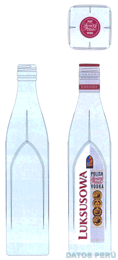 LA FORMA DE UNA BOTELLA DE CUELLO CILÍNDRICO Y HOMBROS ENSANCHADOS PROLONGÁNDOSE HASTA LA BASE EN FORMA RECTANGULAR CON LA DENOMINACIÓN LUKSUSOWA Y LAS FRASES POLISH LUXURY POTATO Y VODKA ESCRITAS EN LETRAS CARACTERÍSTICAS, AL LADO DERECHO EN FORMA VERTICAL SE APRECIA CUATRO MONEDAS Y EN LA PARTE INFERIOR FRASES ALUSIVAS AL PRODUCTO, EN LA PARTE SUPERIOR SE APRECIA LA FIGURA DE UN VITRAL, TODO EN LOS COLORES, GRIS, CREMA, DORADO, CELESTE, AMARILLO, ROJO Y NEGRO; CONFORME AL MODELO ADJUNTO