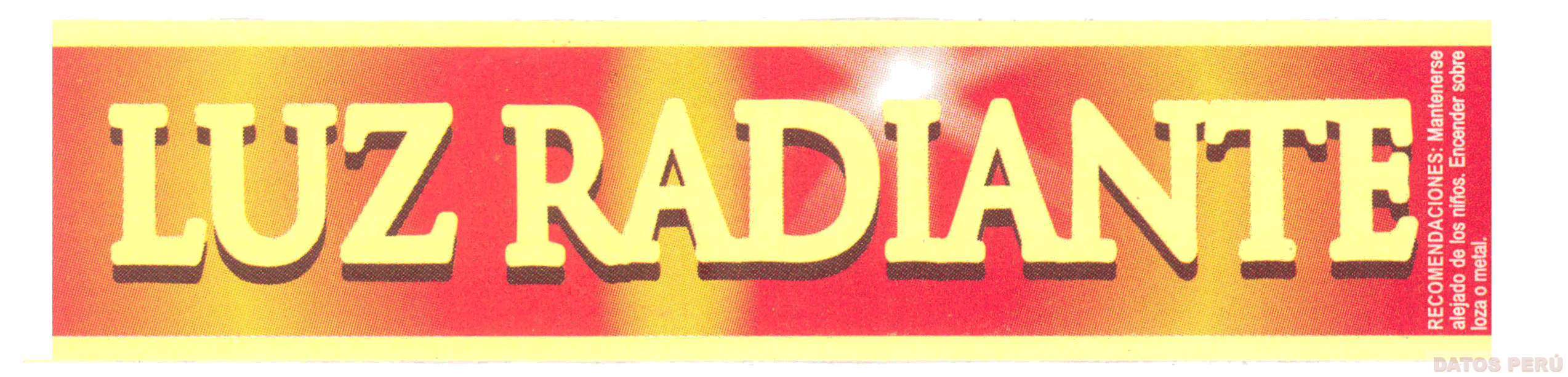 El logotipo rectangular conformado por la denominación LUZ RADIANTE escrita en letras características, seguida de frases alusivas al producto y en medio de dos franjas rectas horizontales, las cuales están ubicadas en los extremos superior e inferior del logotipo, todo en la combinación de colores rojo, amarillo, anaranjado en diversas tonalidades, marrón y blanco; conforme al modelo adjunto