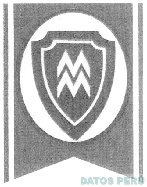 La figura rectangular cuya parte inferior termina en dos puntas, en cuyos lados laterales se aprecian dos líneas verticales sin sombrear, a su interior aparece la figura de un óvalo con borde sombreado e interior sin sombrear que consigna un escudo sombreado donde aparecen las figuras de dos letras M una debajo de la otra, sin reivindicar colores; conforme al modelo adjunto