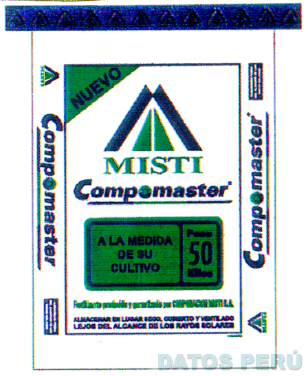 LA ETIQUETA EN LA QUE SE APRECIA TANTO EN LA PARTE SUPERIOR COMO A LOS COSTADOS EN FORMA VERTICAL LA LETRA M ESTILIZADA EN COLOR VERDE (PANTONE 355C) Y AZUL REFLEX, EN CUYA BASE SE ENCUENTRA MISTI EN COLOR VERDE (PANTONE 355C), AL CENTRO Y EN LOS EXTREMOS LATERALES EN FORMA VERTICAL SE APRECIA LA DENOMINACION COMPOMASTER, ESCRITA EN LETRAS CARACTERISTICAS EN COLOR AZUL REFLEX, DESTACANDO LA LETRA O DEL CENTRO EN COLORES VERDE (PANTONE 355C) Y AZUL REFLEX, LA PALABRA ESTA SUBRAYADA POR UNA LINEA HORIZONTAL DE COLOR AZUL REFLEX, DEBAJO SE APRECIA LA FRASE A LA MEDIDA DE SU CULTIVO EN COLOR AZUL REFLEX DENTRO DE UN RECTANGULO CON FONDO VERDE (PANTONE 355C) Y LOS CONTORNOS EN AZUL REFLEX, TODO SOBRE UN FONDO EN COLORES VERDE (PANTONE 355C), AZUL REFLEX Y BLANCO, EN LA PARTE SUPERIOR APARECE UNA CINTA DE SEGURIDAD DE FONDO AZUL CON EL LOGOTIPO MISTI EN COLOR NEGRO QUE SE REPITE A LO LARGO DE LA CINTA; SEGUN MODELO ADJUNTO