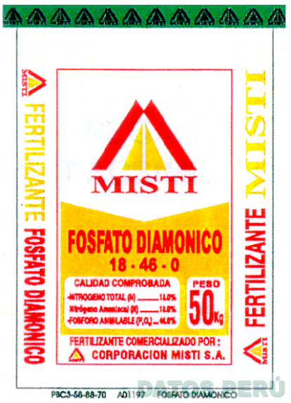 LA BOLSA EN LA QUE SE APRECIA TANTO EN LA PARTE SUPERIOR COMO A LOS COSTADOS EN FORMA VERTICAL Y EN LA BASE IZQUIERDA LA LETRA M ESTILIZADA EN COLOR ROJO (PANTONE 032C) Y AMARILLO (PANTONE 109C O 1235C), EN CUYA BASE SE ENCUENTRA LA DENOMINACION MISTI EN COLOR ROJO (PANTONE 032C) Y EN EL EXTREMO SUPERIOR DERECHO EN FORMA VERTICAL EN COLOR AMARILLO (PANTONE 109C O 1235C), AL CENTRO LAS PALABRAS FOSFATO DIAMONICO EN COLOR ROJO (PANTONE 032C) DENTRO DE UNA FIGURA POLIGONAL EN COLOR AMARILLO (PANTONE 109C O 1235C), LAS MISMAS PALABRAS SE REPITEN EN EL COSTADO IZQUIERDO, MAS ABAJO Y DENTRO DE LA FIGURA POLIGONAL LA FRASE CALIDAD COMPROBADA EN LETRAS ROJAS (PANTONE 032C) ENCERRADO DENTRO DE UN RECTANGULO EN FONDO BLANCO, TODO SOBRE UN FONDO EN COLORES ROJO (PANTONE 032C), AMARILLO (PANTONE 109C O 1235C) Y BLANCO, ENCIMA DE LA BOLSA SE HA INCORPORADO UNA CINTA DE SEGURIDAD DE FONDO VERDE CON EL LOGOTIPO DE MISTI EN COLOR NEGRO QUE SE REPITE A LO LARGO DE LA CINTA; SEGUN MODELO ADJUNTO,