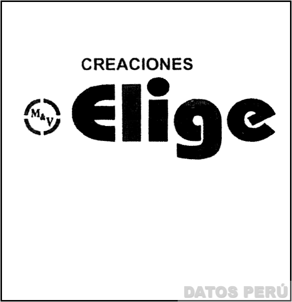 El logotipo conformado por la denominación ELIGE escrita en letras características acompañada al lado izquierdo por una figura irregular en cuyo interior se aprecian las letras M & V y en la parte superior el término CREACIONES escrita en letras características; conforme al modelo adjunto