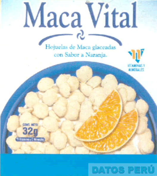 EL LOGOTIPO CONSTITUIDO POR EL DISEÑO DE UN PLATO DE FORMA REDONDA DE COLOR AZUL CONTENIENDO EN SU INTERIOR HOJUELAS DE COLOR BEIGE CLARO CUBIERTAS CON YOGURT Y DOS TAJADAS DE NARANJA SOBREPUESTAS, Y LA DENOMINACION MACA VITAL ESCRITA EN LETRAS CARACTERISTICAS DE COLOR AZUL Y CONTORNO BLANCO; CONFORME AL MODELO ADJUNTO
