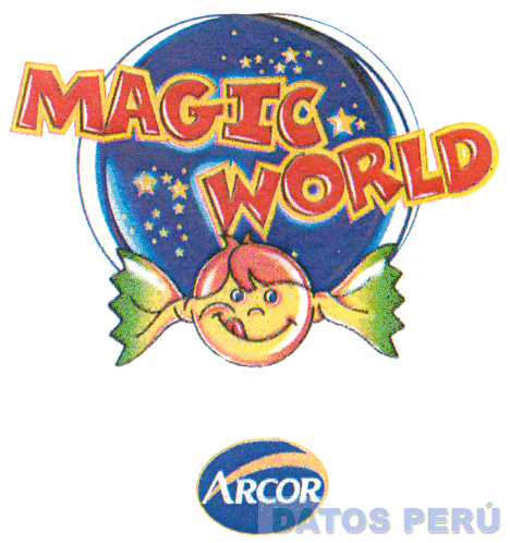 LA ETIQUETA CONFORMADA POR LA DENOMINACION MAGIC WORLD ARCOR EN LETRAS CARACTERISTICAS Y LA CARICATURA DE UN CARAMELO SONRIENTE CON DOS CIRCULOS DE ESTRELLAS DETRAS DE EL, CON LOS COLORES ROJO, AMARILLO, AZUL, VERDE; EN LA PARTE INFERIOR, UN CIRCULO CONTENIENDO LA PALABRA ARCOR CON UNA LINEA OVALADA QUE LO ATRAVIESA; CONFORME AL MODELO