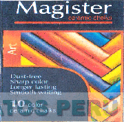 La denominación MAGISTER CERAMIC CHALKS escrita en letras características, debajo de la cual se aprecia una línea horizontal, así como la representación de tizas en forma diagonal a ambos lados; al lado izquierdo se aprecian las frases ART, DUST-FREE SHARP COLOR LONGER LASTING SMOOTH WRITING y 10 COLOR CERAMIC CHALKS escritas en letras características; todo en los colores azul, rojo, anaranjado, morado, rosado y amarillo; conforme al modelo adjunto