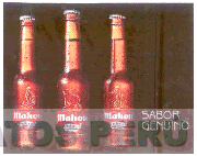 La figura conformada por tres botellas color anaranjado en degradé, en las que se distingue la denominación MAHOU escrita en letras características en letras blancas sobre fondo rojo, debajo la figura de una cinta blanca con cinco estrellas; en la botella de la izquierda se distingue la figura estilizada de una bailarina de flamenco, en la del centro un toro, y en la de la derecha un torero, todo sobre fondo negro; en el lado inferior derecho la denominación SABOR GENUINO (sin reivindicar) escrita en letras características en colores blanco y amarillo; conforme al modelo adjunto
