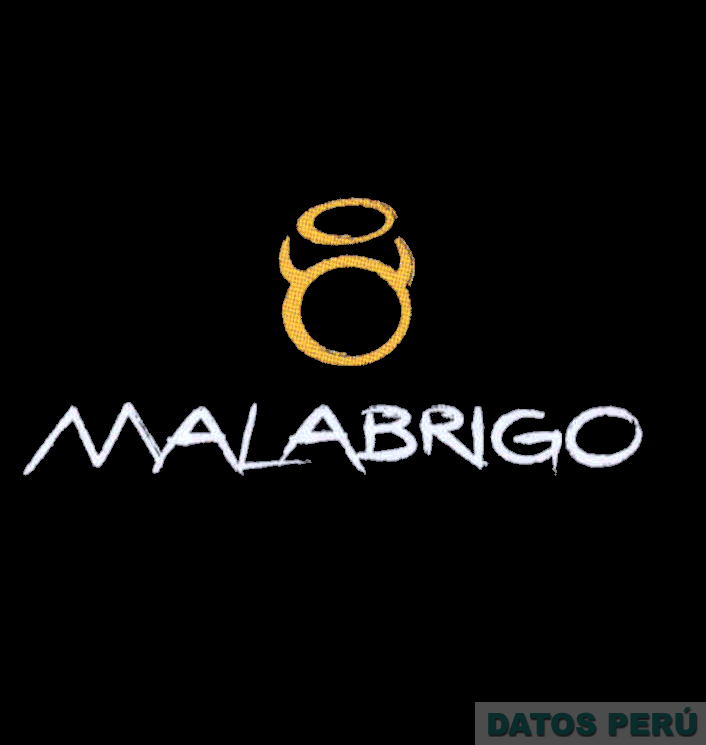 El logotipo conformado por la denominación MALABRIGO escrita en letras características de color blanco y en la parte superior, la representación estilizada de una figura circular con cachos y una aureola en color amarillo sobre fondo negro; conforme al modelo adjunto