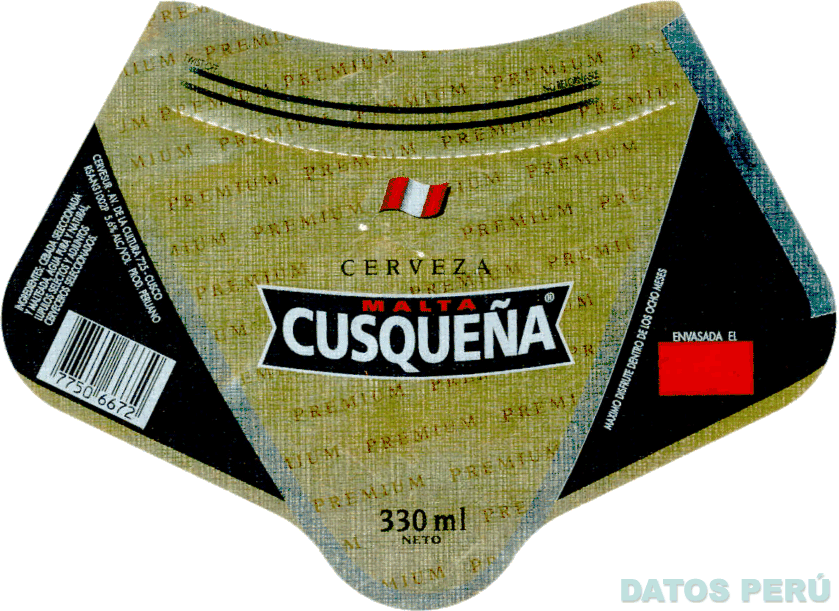 La etiqueta de forma envolvente que lleva en la parte superior la bandera peruana flameando y en la parte central la denominación MALTA CUSQUEÑA escrita en letras estilizadas dentro de una figura poligonal irregular, y la palabra CERVEZA, sin reivindicar, en la combinación de colores dorado, rojo, blanco y negro; conforme al modelo adjunto