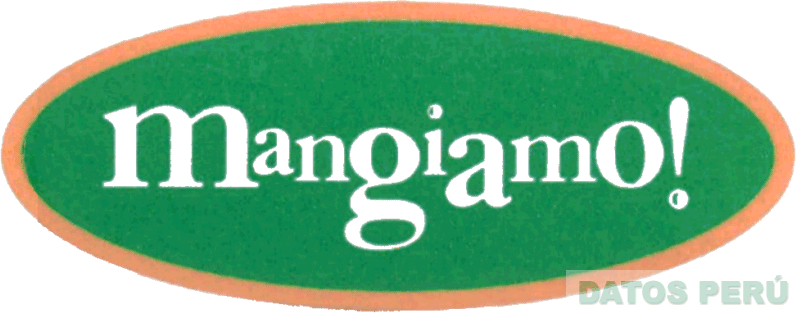 El logotipo conformado por la figura ovalada con fondo en color verde pantone 363 y borde color anaranjado pantone 151 y la denominación MANGIAMO escrita en letras características seguida de un signo de exclamación todo en color blanco; conforme al modelo adjunto