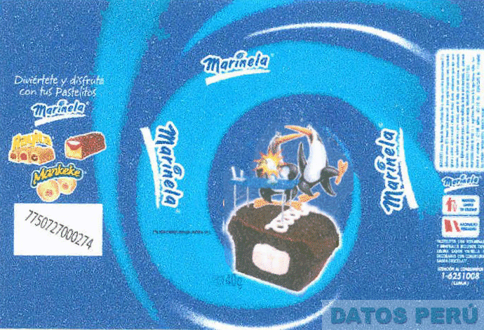 El logotipo conformado por las denominaciones MANKEKE, MARINELA y RAYITA escrita en letras características, en la parte central se aprecia la figura de un keke relleno y las figuras estilizadas de dos pingüinos, uno de ellos pintado de oscuro al simular una explosión y otro simulando una sonrisa, detrás se observa un espiral, a los lados se aprecian frases alusivas al producto y la representación de kekes (ambos sin reivindicar), todo en los colores rojo, marrón, blanco, azul, celeste, amarillo, anaranjado y negro; conforme al modelo adjunto