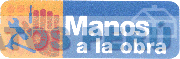 El logotipo conformado por una figura rectangular dividida en dos segmentos; en el segmento izquierdo se aprecia figuras estilizadas de una mano, martillo, llave inglesa, desentornillador y varios círculos, en colores rojo, azul y anaranjado, todo con fondo amarillo; en el segmento derecho se observa la denominación MANOS A LA OBRA escrita en letras características de color blanco y al costado superior derecho se aprecia la figura estilizada de una casa de color celeste, todo en fondo azul; conforme al modelo adjunto