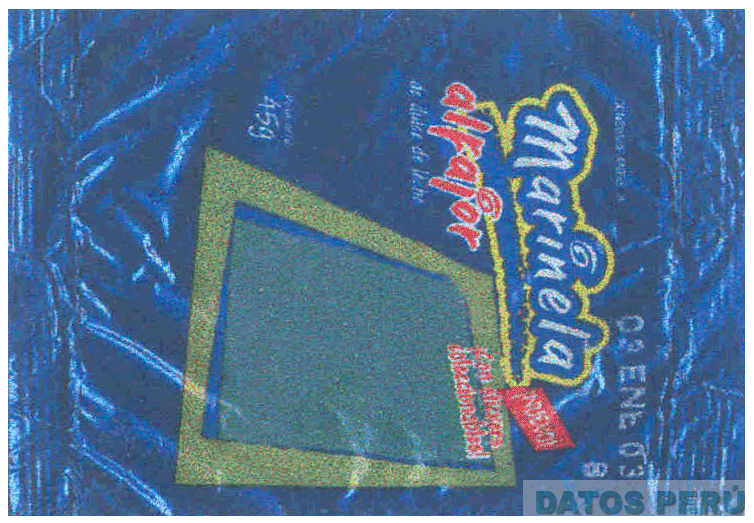 LA ENVOLTURA CON LA DENOMINACIÓN MARINELA ALFAJOR DE DULCE DE LECHE ESCRITA EN LETRAS CARACTERÍSTICAS, Y RECTÁNGULOS IRREGULARES, TODO EN COLORES AZUL, VERDE, ROJO, BLANCO Y AMARILLO; CONFORME AL MODELO ADJUNTO