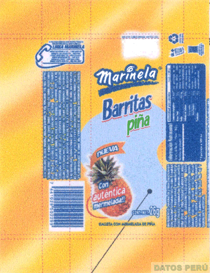 La envoltura conformada por la denominación MARINELA escrita en letras características y subrayada por una línea estilizada y debajo la frase BARRITAS PIÑA escrita en letras características; en la parte inferior se aprecia la denominación NUEVA (sin reivindicar) dentro de una cinta ondulante, y la frase CON AUTENTICA MERMELADA (sin reivindicar) sobre la figura de una piña y demás leyendas alusivas al producto (sin reivindicar) en los colores amarillo, blanco, rojo, celeste, gris, azul, anaranjado, verde y negro; conforme al modelo adjunto