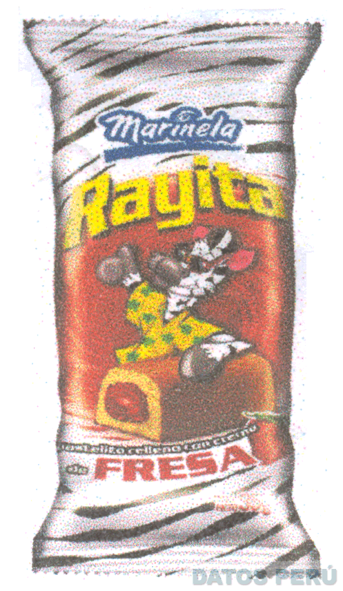 La etiqueta conformada por las denominaciones MARINELA, RAYITA y FRESA escritas en letras características acompañadas de la representación estilizada de una cebra humanizada apoyada en un bizcocho; todo en los colores negro, marrón, azul, blanco, amarillo, verde y rosado; conforme al modelo adjunto