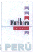 La etiqueta conformada por la denominación MARLBORO FILTER PLUS, escrita en letras características, dentro de una etiqueta rectangular, la cual se encuentra dividida en dos partes, donde el término MARLBORO aparece en la parte superior y bajo tres figuras de forma irregular, y la frase FILTER PLUS en la parte inferior dentro de un recuadro, bajo la cual se observa una figura de forma irregular, todo en los colores negro, rojo, gris y blanco; conforme al modelo adjunto