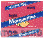 LA ETIQUETA CON LA DENOMINACION MARQUESITAS ROYAL VAINILLA, SIN REIVINDICAR LA PALABRA VAINILLA, FIGURA CUADRADA DE FONDO ROJO, CON RAYITAS MUY PEQUEÑAS, Y FRANJAS TRANSVERSALES DE FONDO AZUL Y LINEA BLANCA, SOBRESALIENDO LA PALABRA MARQUESITAS, EN BLANCO, AL CENTRO SE APRECIA 2 GALLETAS, LA DENOMINACION VAINILLA Y ROYAL EN AZUL, SEGUN MODELO ADJUNTO,
