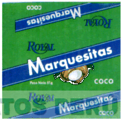 LA ETIQUETA CON LA DENOMINACION MARQUESITAS ROYAL COCO, FIGURA CUADRADA, DE FONDO VERDE, CON FRANJAS TRANSVERSALES DE FONDO AZUL Y LINEA BLANCA SOBRESALIENDO LA PALABRA MARQUESITAS EN BLANCO, Y AL CENTRO SE APRECIA LA FIGURA DE DOS COCOS Y UNA PARTIDA, LA PALABRA ROYAL EN AZUL, SEGUN MODELO ADJUNTO,