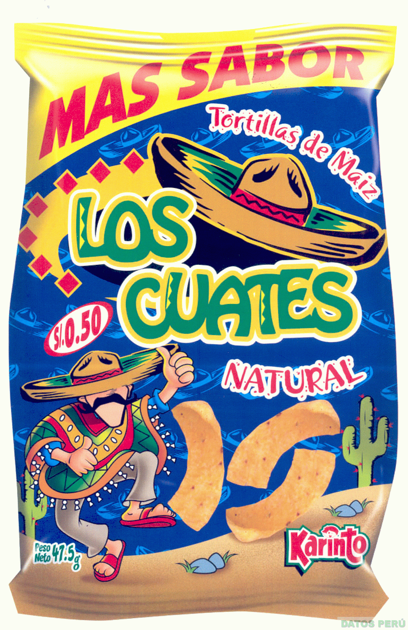 La denominación MAS SABOR LOS CUATES NATURAL KARINTO y logotipo (se reivindican colores), conforme al modelo