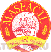 La etiqueta de forma redonda que contiene en la parte circular interna la forma estilizada de cuatro personas sobre fondo rojo claro y flores blancas, uno de ellos lleva un gorro de chef, la parte externa del circulo es de color rojo en ella se encuentra la denominación MASFACIL y dos espigas de color amarillo, en la parte inferior se aprecia una franja en forma de arco que contiene la denominación RICA, FACIL, RAPIDA escrita en letras características de color rojo sobre un fondo amarillo, y la figura estilizada de un rodillo debajo; conforme al modelo adjunto