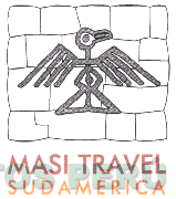 El logotipo constituido por el diseño de un ave color gris sobre un fondo de pared inca delineado color gris compuesta por 18 cuadritos y la denominación MASI TRAVEL con mayúscula escrita en color guinda y SUDAMERICA con mayúscula escrita en color anaranjado; conforme al modelo adjunto