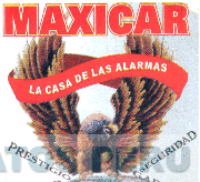 La denominación MAXICAR escrita en letras características con la frase LA CASA DE LAS ALARMAS escrita en letras características dentro de una figura irregular y la figura estilizada de un ave con las alas extendidas, en los colores rojo, blanco, marrón, celeste y negro; conforme al modelo adjunto