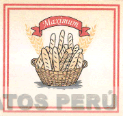 El logotipo cuadrangular que presenta dos líneas de color rojo paralelas alrededor del logotipo y dentro del cual se aprecia la denominación MAXIMUM escrita en color blanco dentro de la figura de una cinta de color rojo, debajo de la cual se encuentra una canasta con panes y espigas, en colores beige, crema y gris; conforme al modelo adjunto