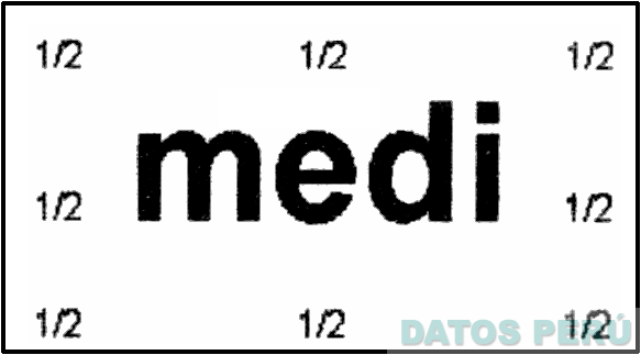 La denominación MEDI escrita en letras características y la cifra ½ escrita ocho veces, dentro de una figura rectangular; conforme al modelo adjunto