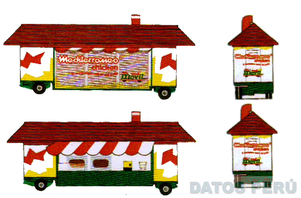 El logotipo constituido por las denominaciones MEDITERRANEO CHICKEN EL VERDADERO SABOR DEL POLLO y MEDIMOVIL, escrita en letras características en los colores rojo, blanco y verde; y la figura de un trailer de camión que asemeja una casa con tejado de color rojo, chimenea roja, toldo blanquirrojo y laterales con colores rojo, verde, amarillo y blanco, conforme al modelo adjunto