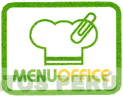 El logotipo conformado por la denominación MENU OFFICE escrita en letras características y la representación de un gorro de chef con un clip sobrepuesto, todo dentro de una figura de bordes redondeados y en los colores verde (pantone 361C) y amarillo (pantone 137C); conforme al modelo adjunto